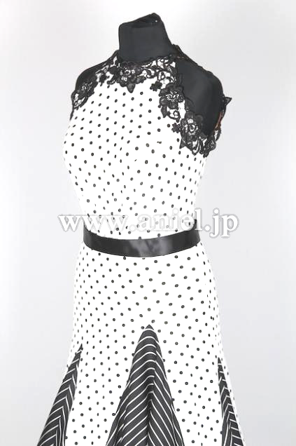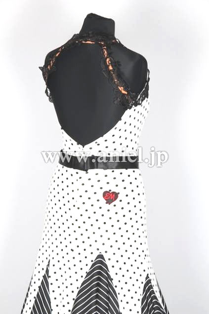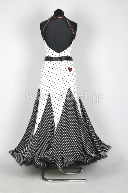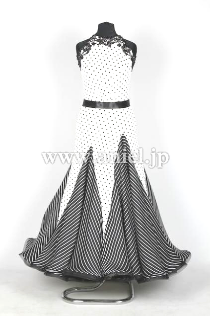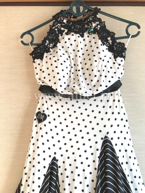 リトアニアのEMクチュールが制作した大変個性的でオリジナリティがあって目立つ水玉×ストライプ柄のスタンダードドレスです。