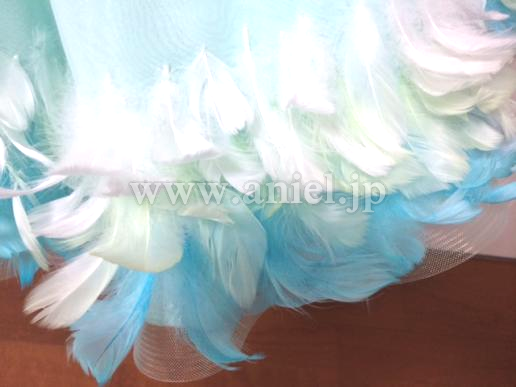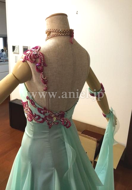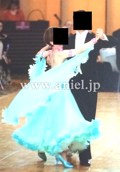 ボディは2ウェイとストレッチサテン、スカートはオーガンジーとサテン、ジョーゼットで3枚重ねになっています。内側は白です。裾はホースヘアの上にグラデーションで羽根が載せてあり、これが動きをよく出してくれて観ていたかたからとてもほめられました。