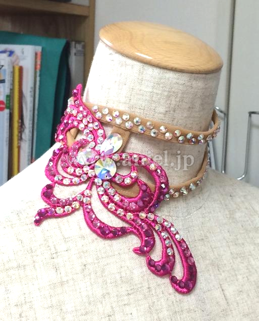 チョーカー、バングルにはボディと同じく濃いピンクのモチーフがあしらわれていてとても可愛らしいアクセントになっています。特にチョーカーはアシンメトリーでホールドをきれいに見せてくれます。