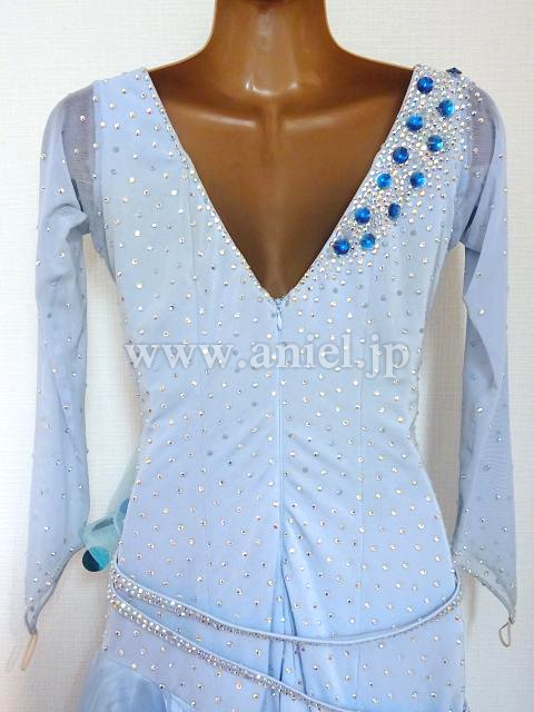 パステルブルーの長袖斜めフリルのワンピース