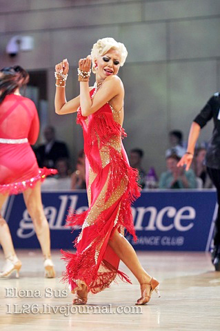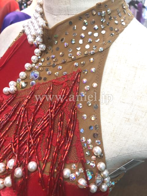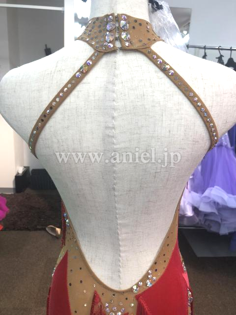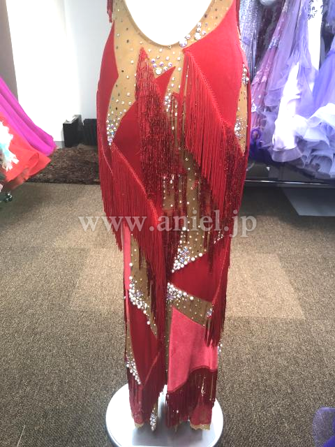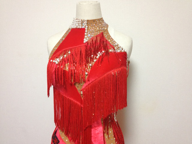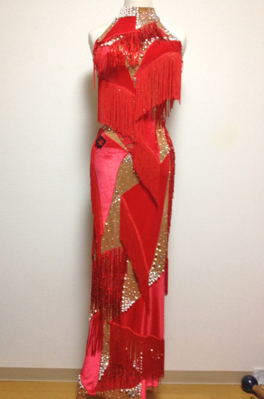 赤のベロア&赤のレースがベージュの生地が無造作に貼り付けられています。また、フリンジと竹ビーズフリンジが付けられています。また、ベージュ生地部分にはパールとオーロラのストーンが貼り付けられており、大変上品なドレスです。