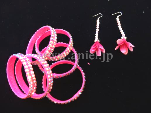 アクセサリーは輪っか6つと可愛らしいお花の付いたピアスです。
