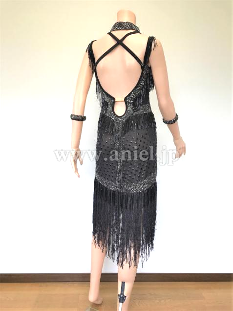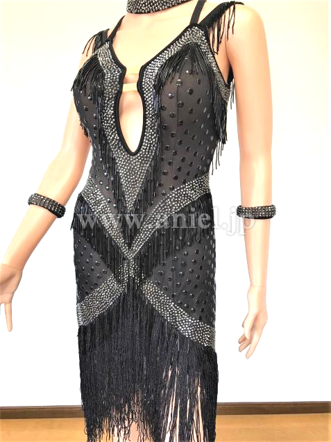 アクセントに黒ラインストーン、ビーズフリンジをあしらいスカートはフリンジになっています