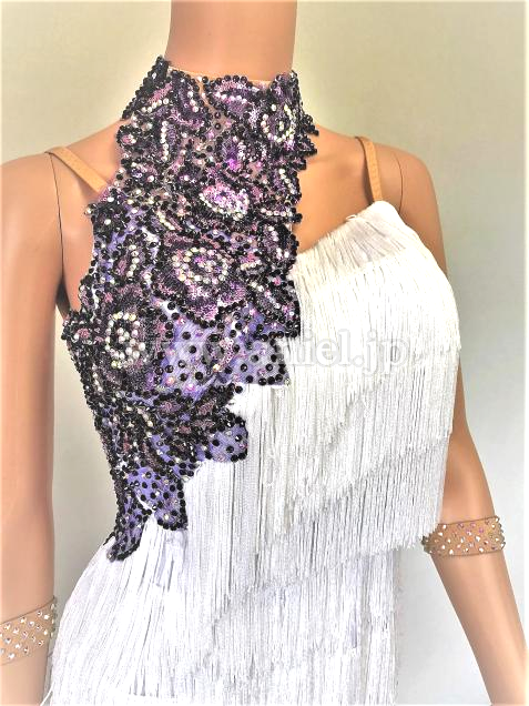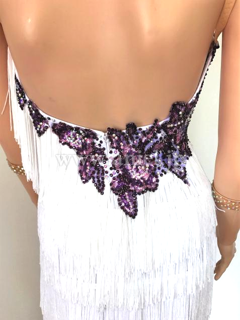 パープルのスパンコール花モチーフがホワイトドレスを一層引き立てています