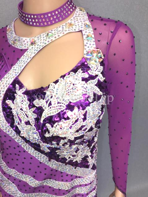 ボディ全体にラインストーンを施し、左フロントから背中にかけてスパンコールの上にフラワーモチーフをあしらい、
