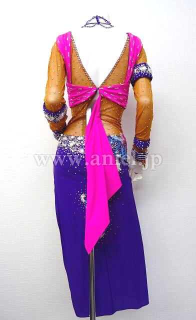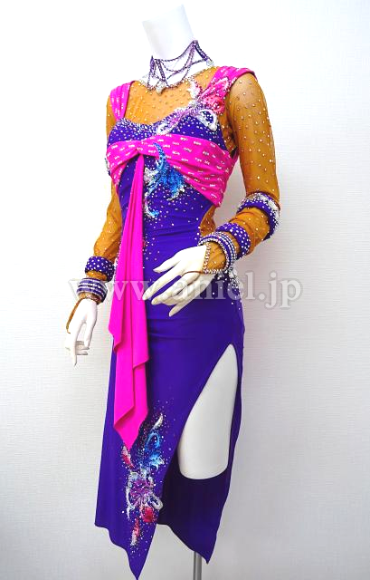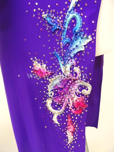 紫の斜めロングドレス。