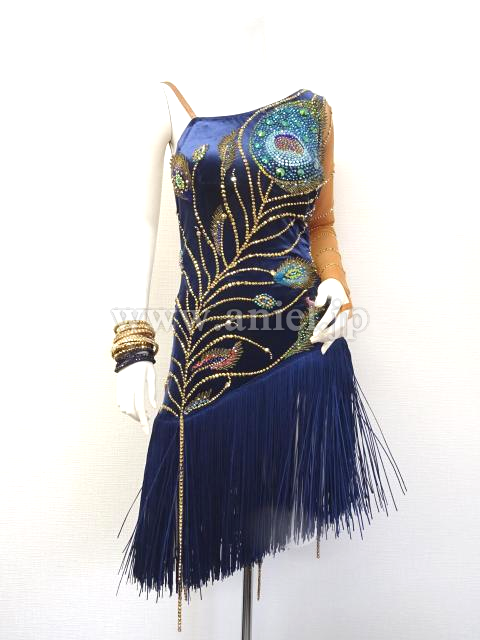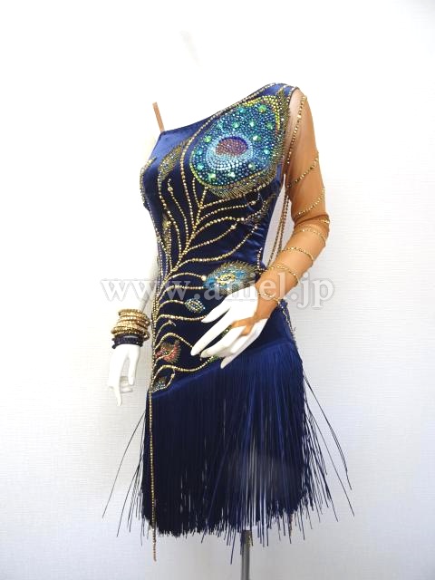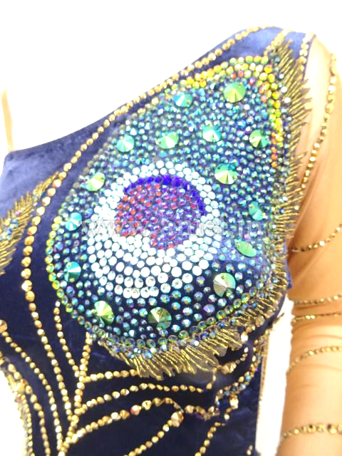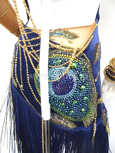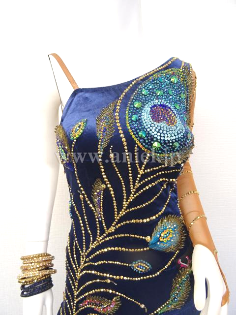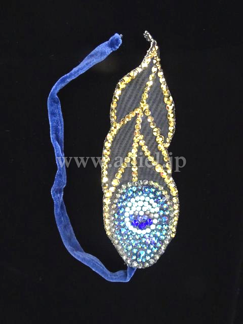 美しい孔雀のモチーフの装飾があり、斜めのラインを強調するようにブルー系やグリーン系、ピンクグリーンなどのスワロフスキの石がぎっしりと貼られていて非常に豪華で印象的です。