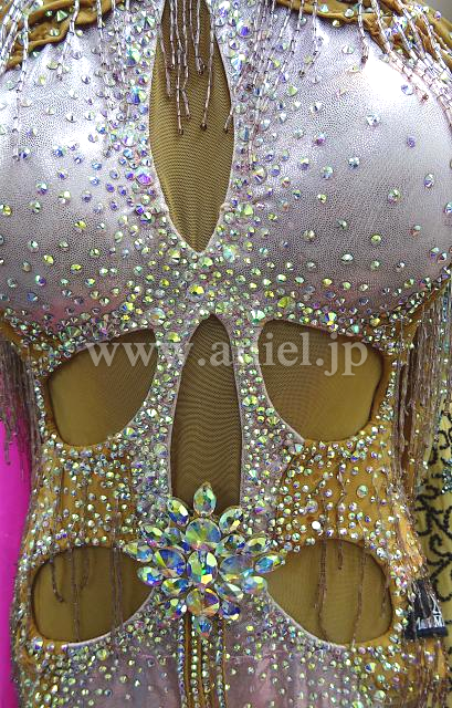 背中の飾りやドレープは踊る度動いて華やか、大粒のストーンがよく輝きます。