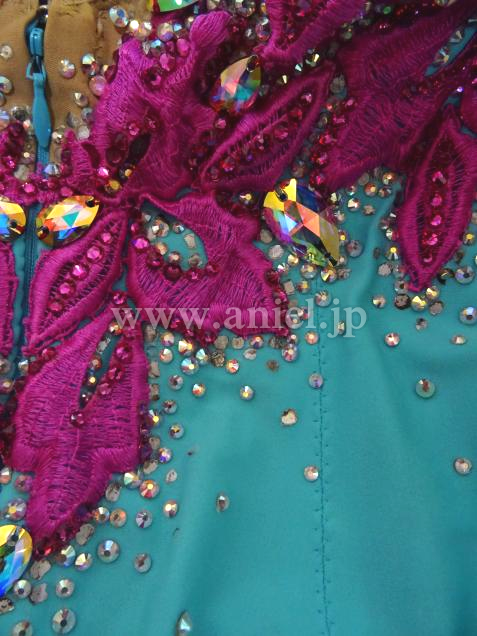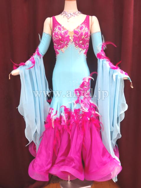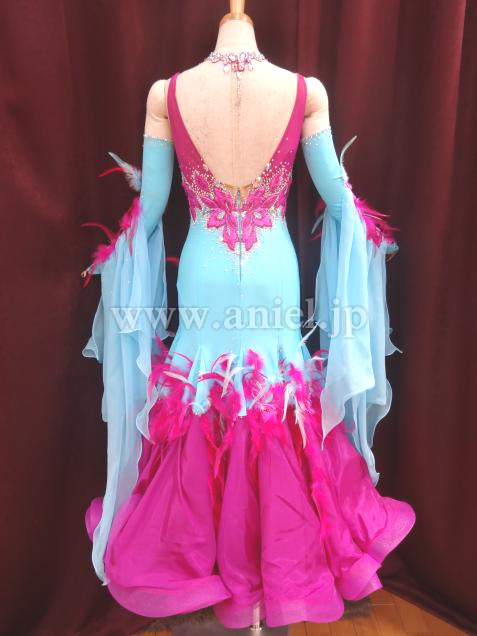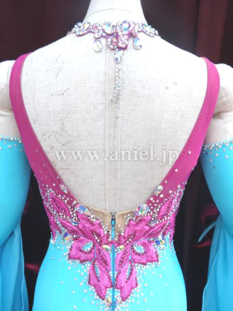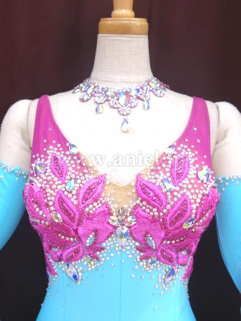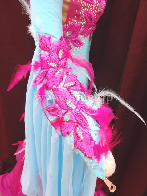 水色のボディに鮮やかなショッキングピンクの組み合わせの、可愛らしいドレスです。