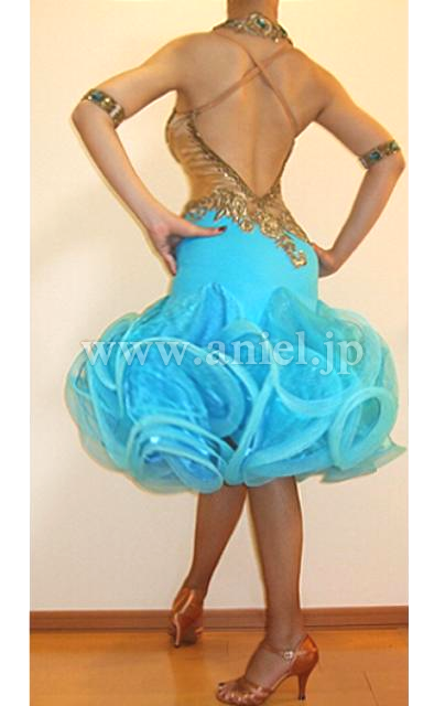 上半身は光沢のあるゴールド生地、ダイヤびっしりに凝ったデザインが非常にゴージャス。ホースヘアがつけられボリュームのあるスカートが踊るとよく振れてエレガントさも可愛らしさもゲット!