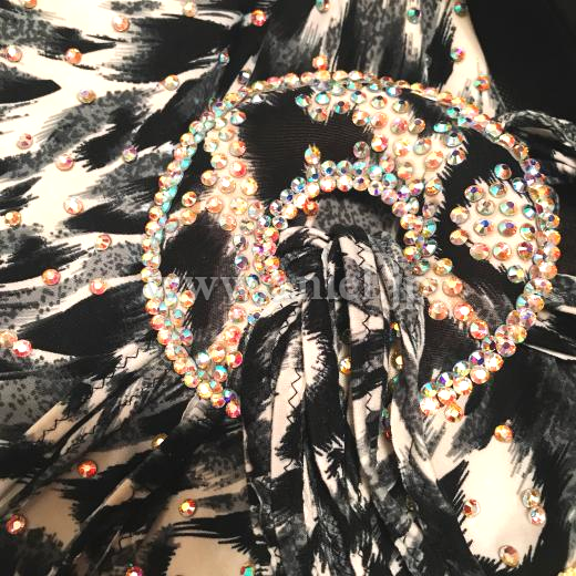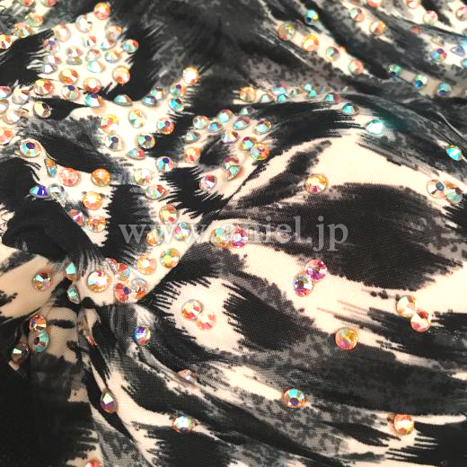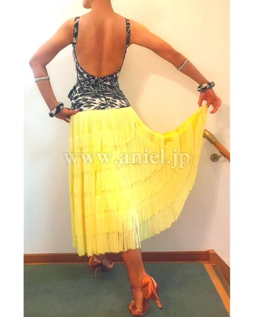 鮮やかな黄色のスカートに豹柄のボディがインパクトを出しながらも上品なドレスです。ボディにはダイヤびっしり、スカートはフレアスカートにさらにフリンジの動きも取り入れて、物凄くよく広がって動くドレスです。