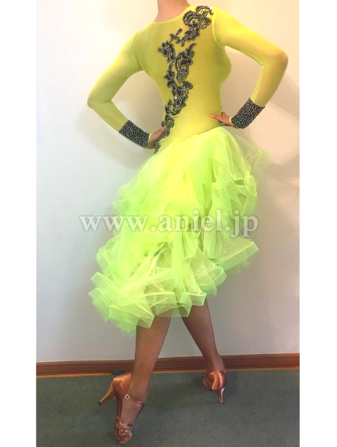 全体がネットになっており透け感があります。鮮やかな蛍光緑のボディに黒のモチーフがインパクト、上半身露出が抑えられています。フリルスカートはサイドが開いているデザインで、足の付け根が見えセクシーです。