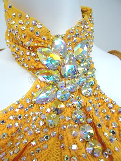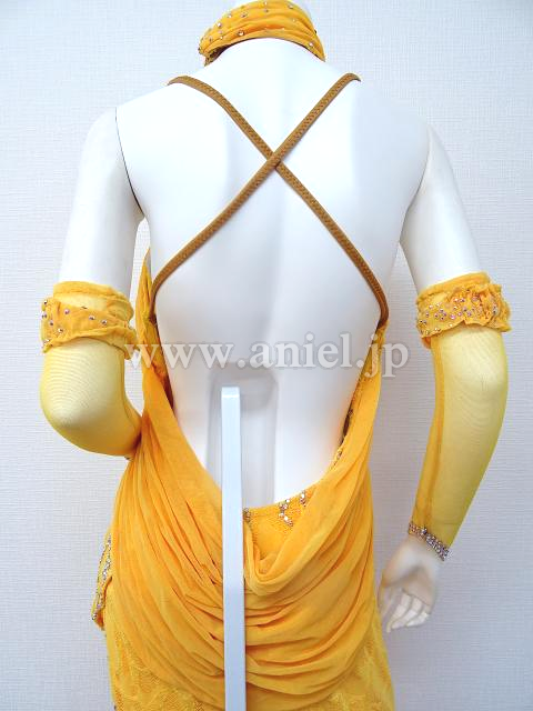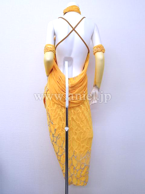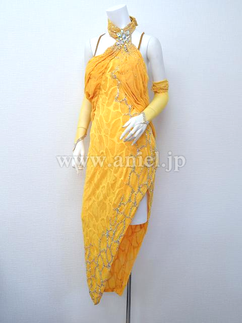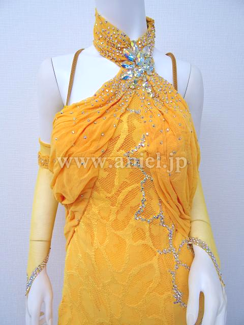 ホルターネックのイエローロングドレス。