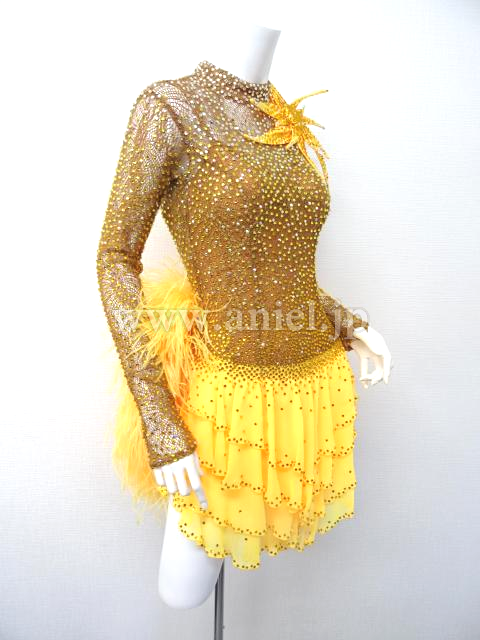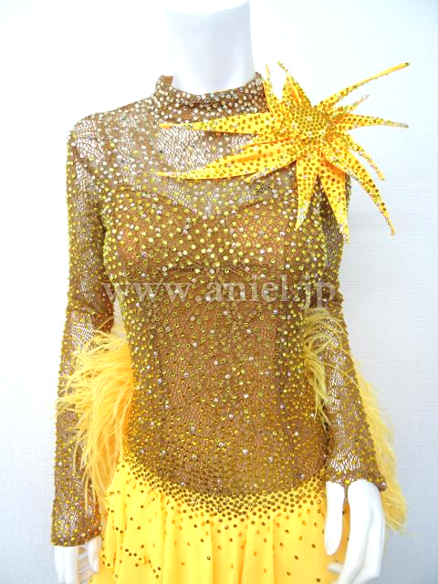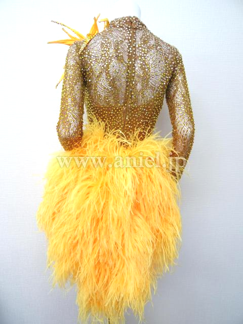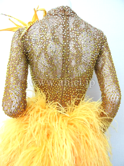 ベージュのハイネックに黄色の羽根たっぷりのドレス。