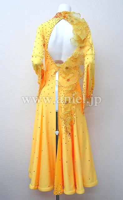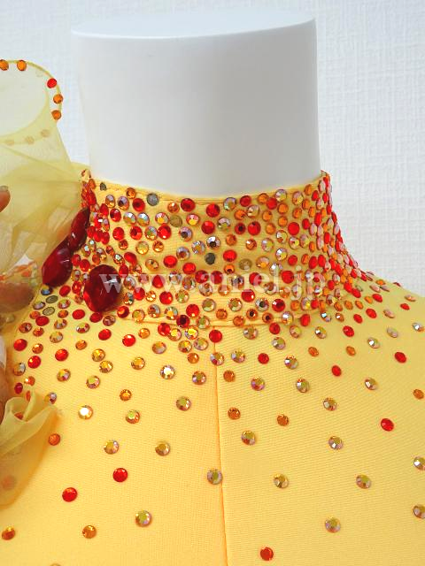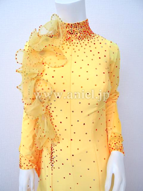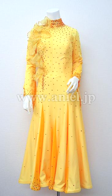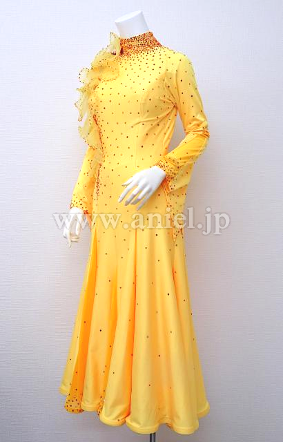 シンプルなデザインのハイネックロングスリーブの黄色ドレス。