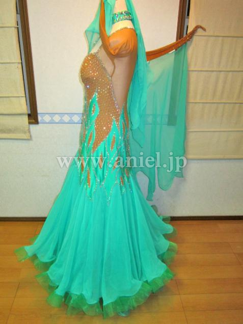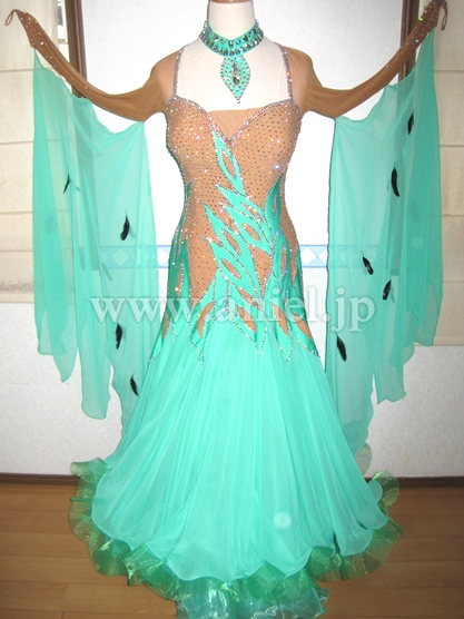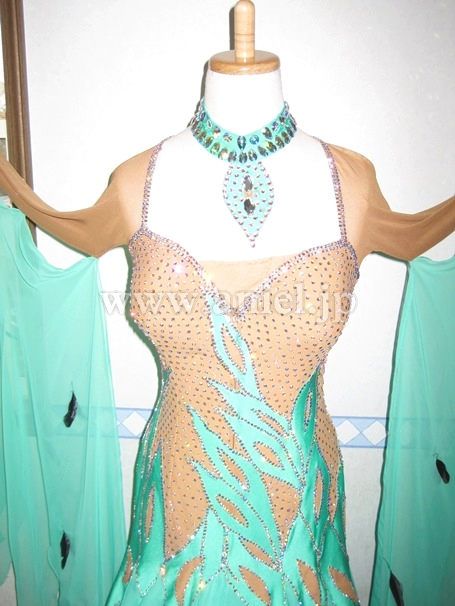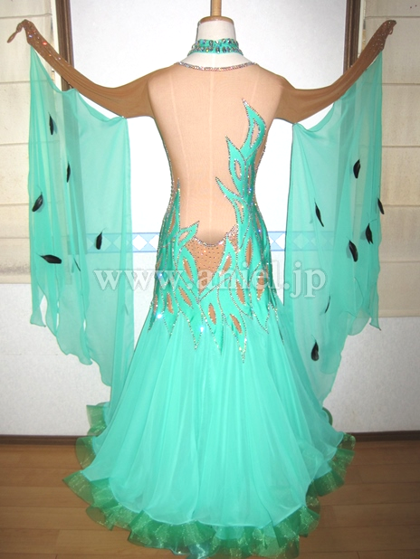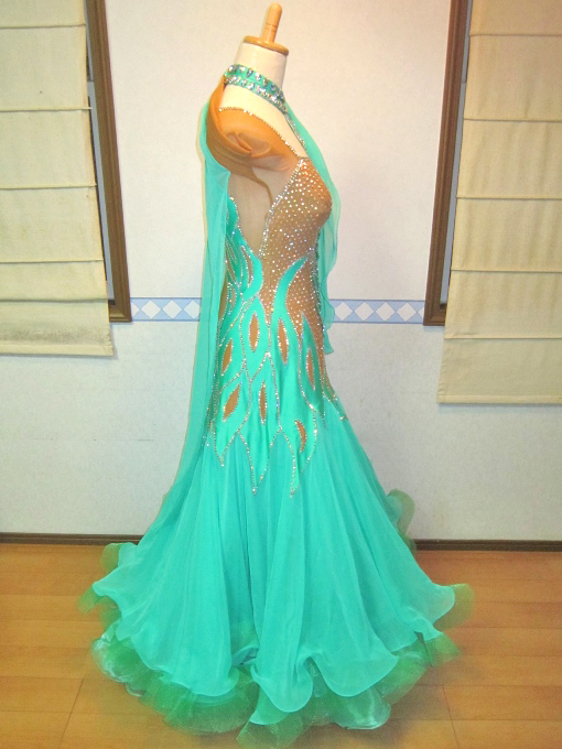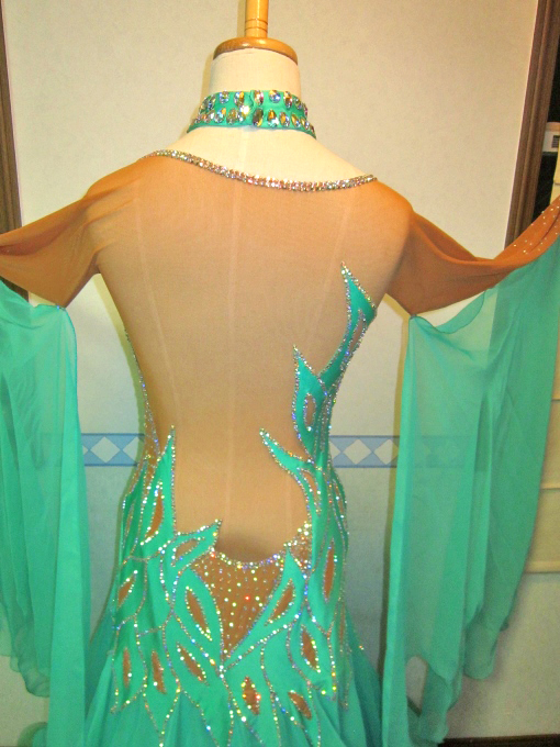 エメラルドグリーンの布を一枚一枚葉っぱのように切り取りデザインをしてから縫い付け、石張りをした大変手のかかったドレスです。サイドファスナーでとても着用しやすく、背中は全部スキンカラーのネットでおおわれていながらも背中のデザインがセクシーなドレスです。露出度を控えたい方にもぴったりのドレスです。