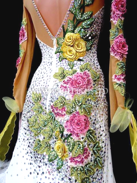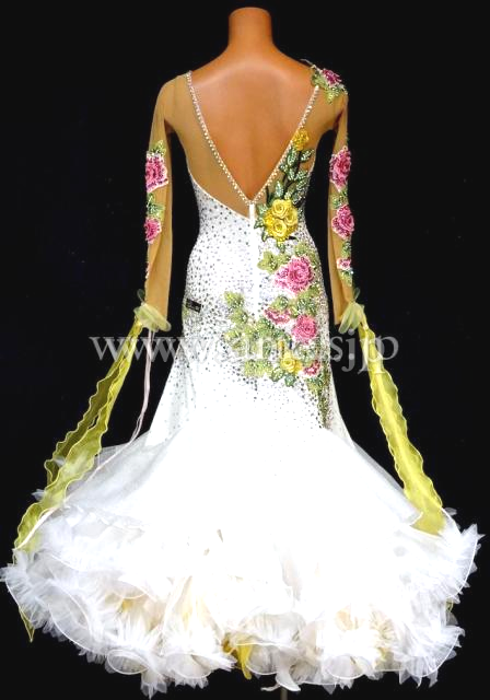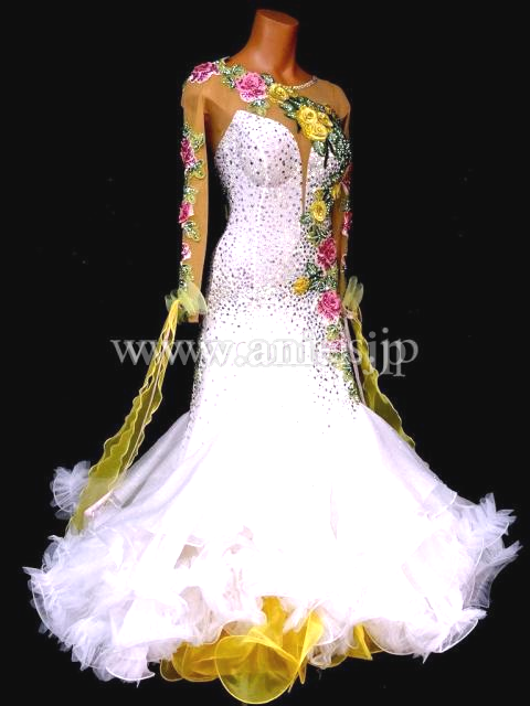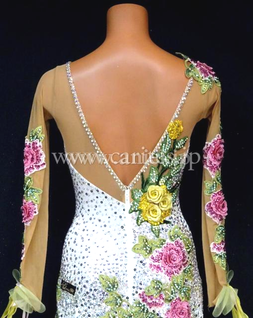 ピンク、イエローカラーの花モチーフを使用し、上品なデザインのドレス。