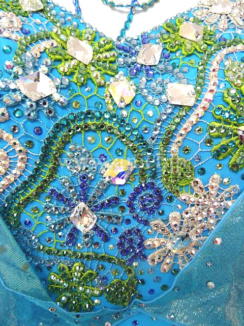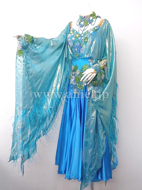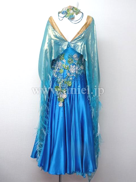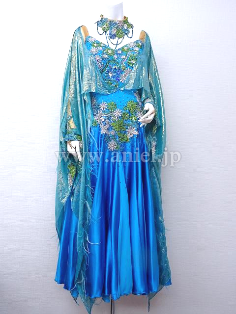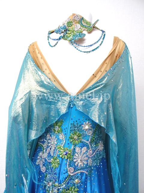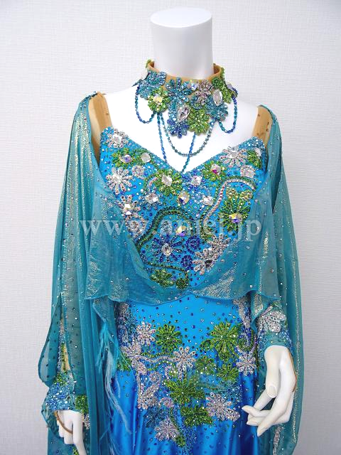 コバルトブルーに緑と白のモチーフとストーンが豪華なドレスです。