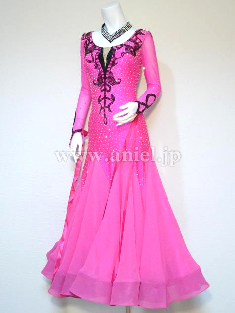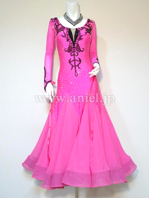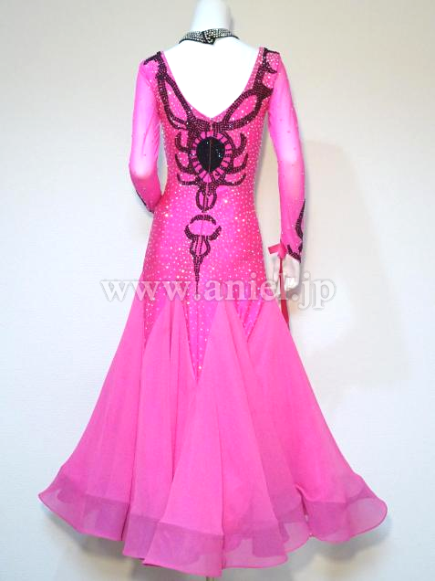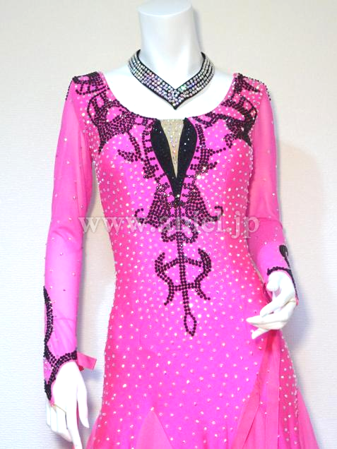鮮やかなショッキングピンクに黒のストーンで模様が描かれているドレスです。