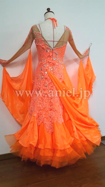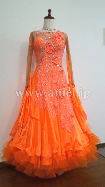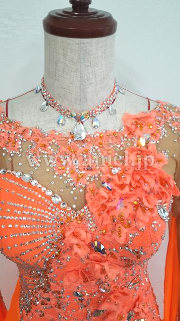 あざやかなオレンジのドレスです。フロアで一際映え、競技会やデモに最適です。露出度が少なく上品なデザインなので着用しやすいと思います。チョーカー付属。スワロフスキー使用。