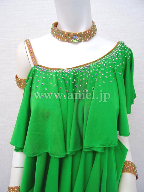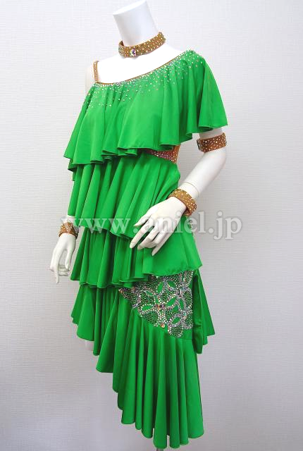 緑のワンショルダーフリルドレス。