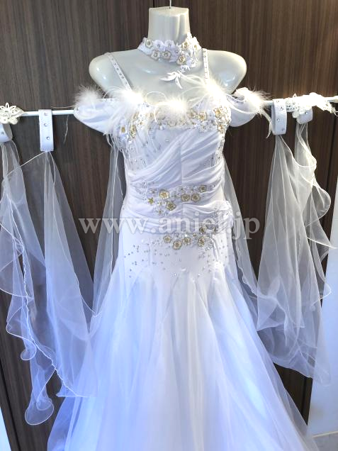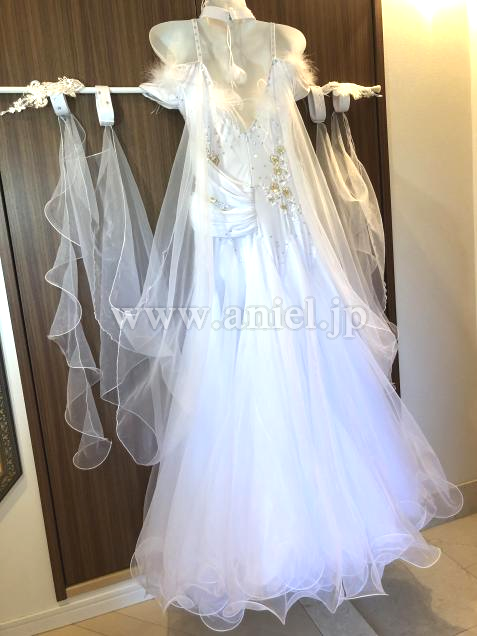 王道の真っ白な綺麗なドレスです。見頃は伸縮する、着やすいドレスで、オフショルダーが、二の腕をカバーします。ウエストをカバーしてくれるデザインになっているのも嬉しいです。インナーパンツが付いてます。