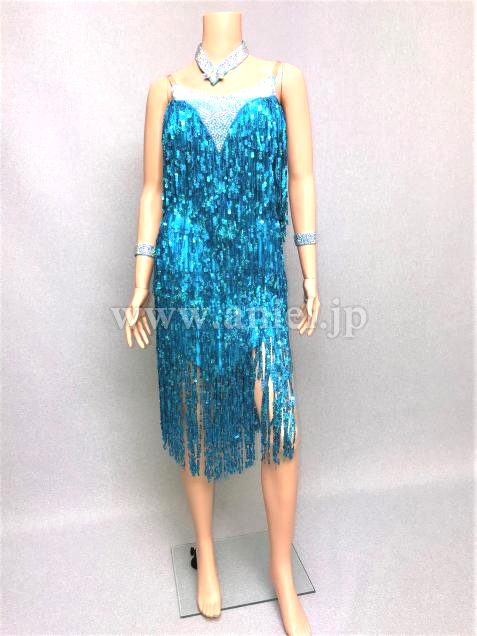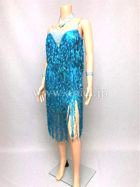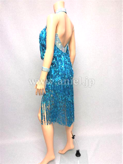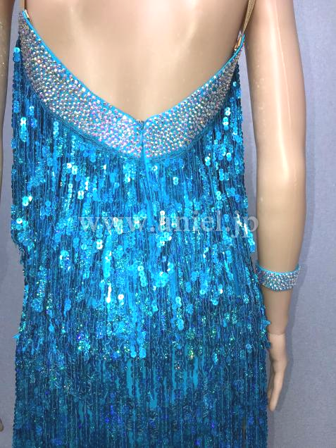 胸元から背中まで1周びっしり敷き詰めたオーロラ色ラインストーンがセーラーブルースパンコールを一層引き立てます