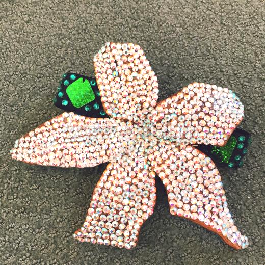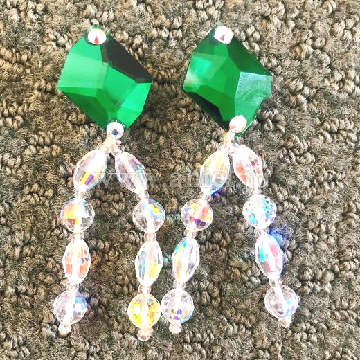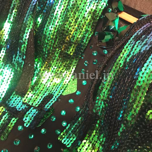 グリーンのスパン生地がキラキラ輝いとっても踊りやすくて、フロア映えするドレスです、首飾りはオーロラのストーンでびっしり貼られていて、ゴージャスでエレガント