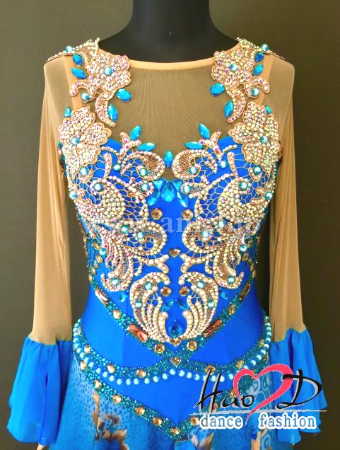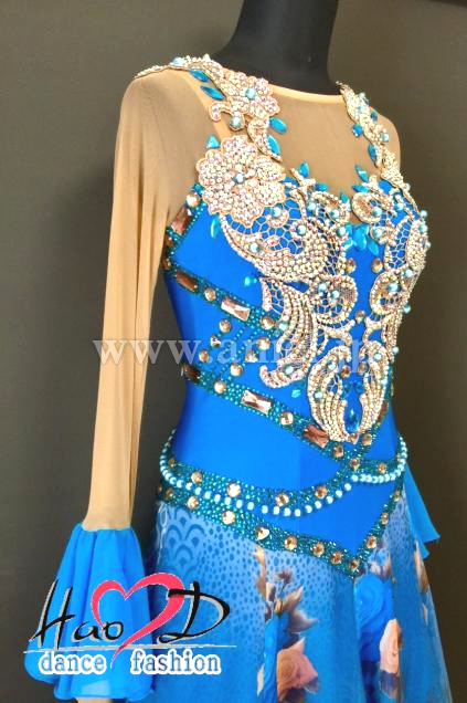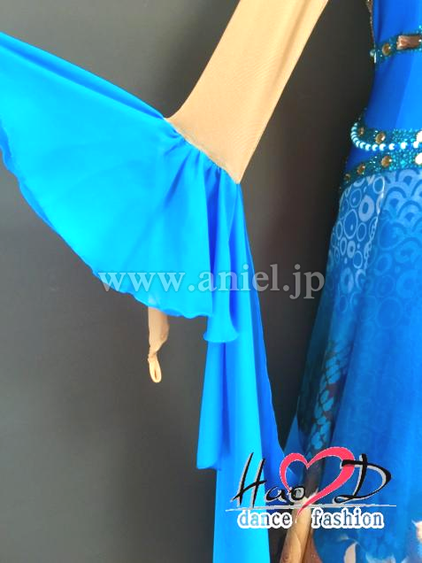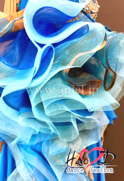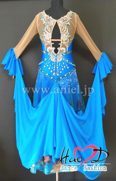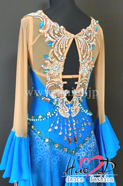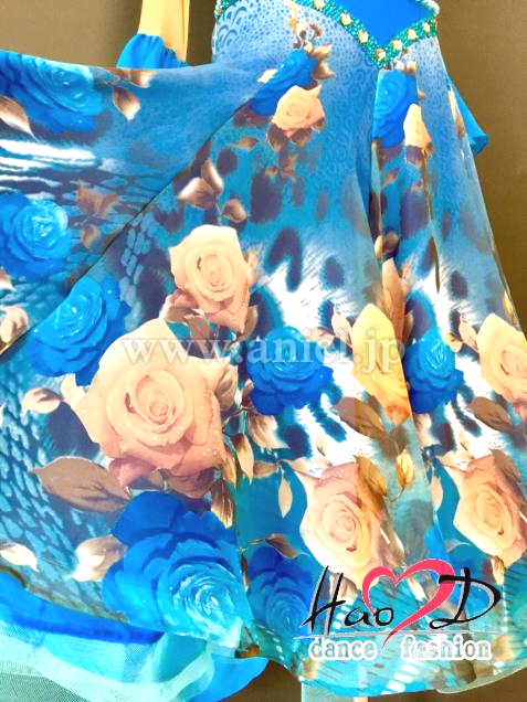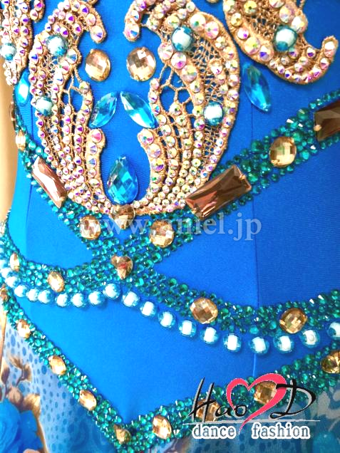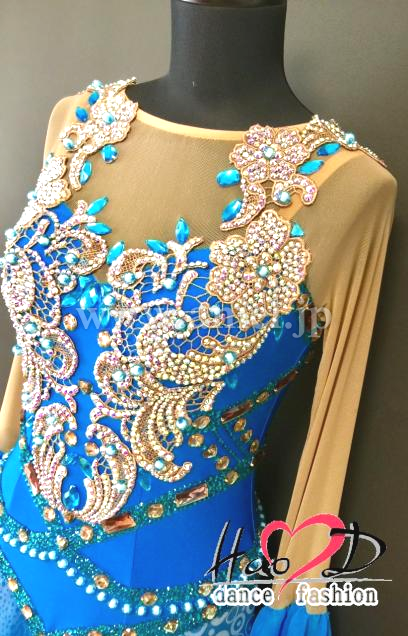 スカートのベージュに合わせ、モチーフを繊細に縫い付け、みっちり付けたオーロラ石と大粒石やビーズが豪華に輝く