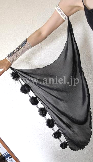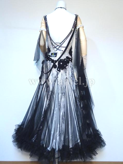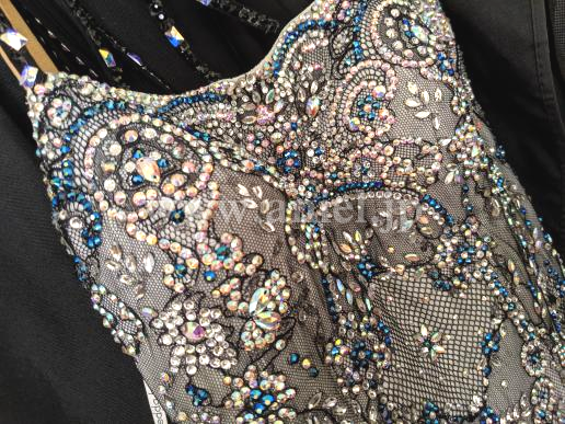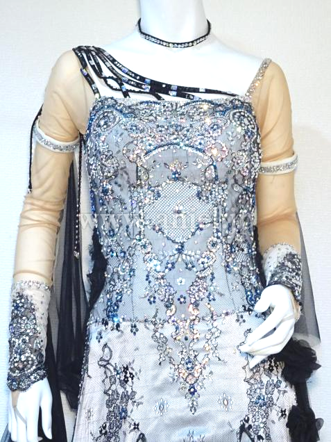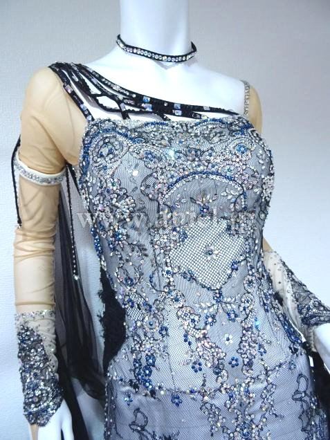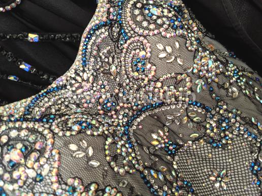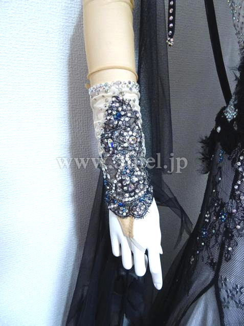 また、石取れがだいぶありましたが(トルソーの写真)、ほとんど貼り直しました(最後の方の写真)。また、人がつけてる写真のとおり、フロートをなびかせたく両腕ともリフォームしました。背中のグローブとつながにっている、石のついていない長い黒い紐は、ちょっとごちゃごちゃしてるとの意見があり、取りました。当初のチュールのフロートと背中の黒い長い紐もおつけしますので、手縫いで簡単に元に戻すことも可能です。珍しい色の青いスワロの新品の石を、少しお付けします。石の模様が大変美しく、スワロがキラキラしており、見惚れるドレスです。