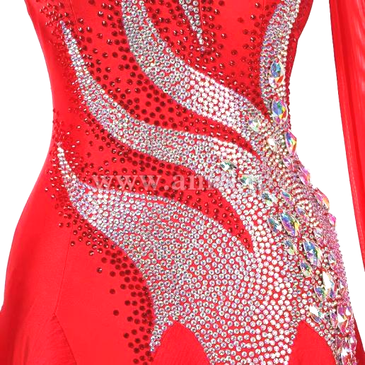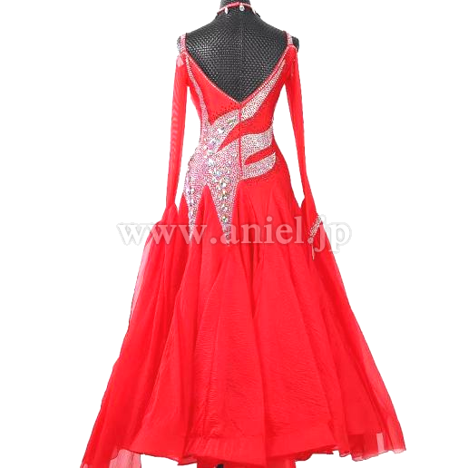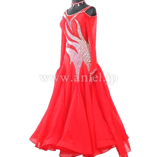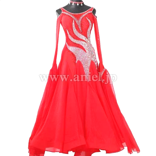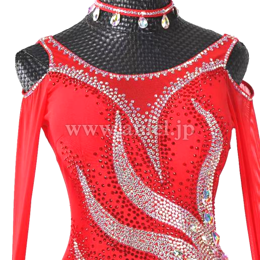 鮮やかな赤のボディにストーンびっしりの模様が描かれたドレスです。