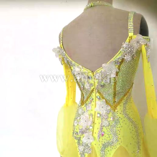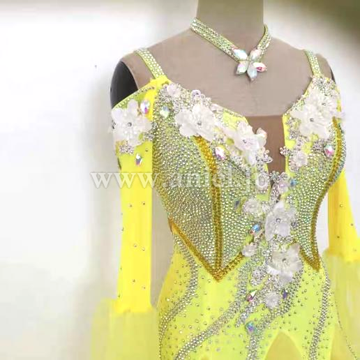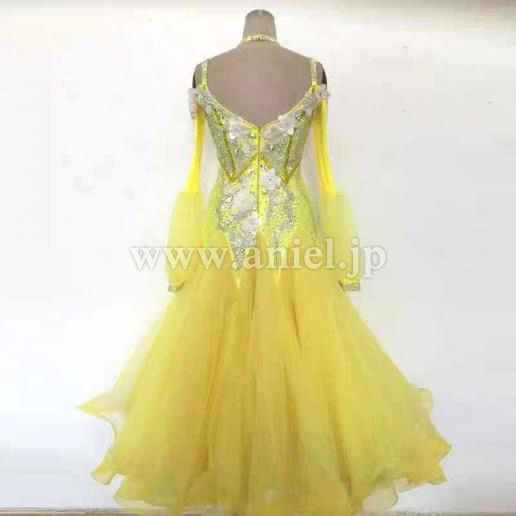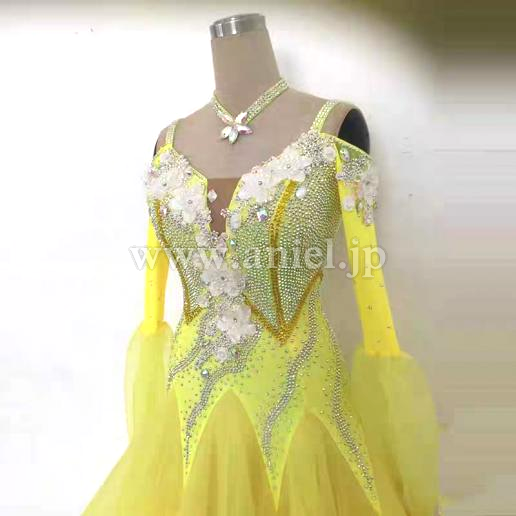 黄色のボディに白のモチーフレースが映えるドレスです。