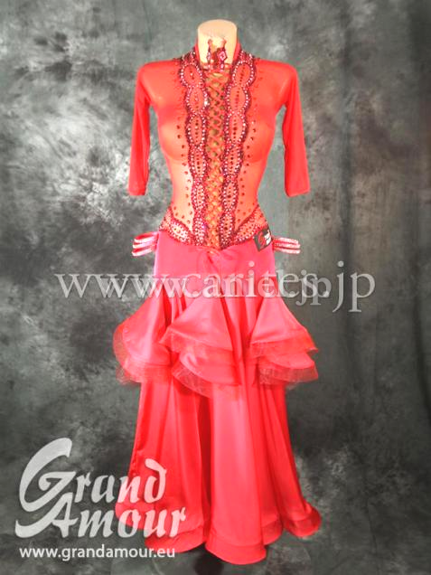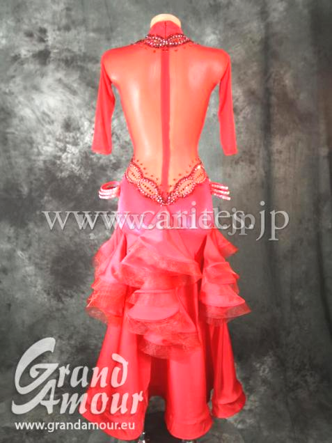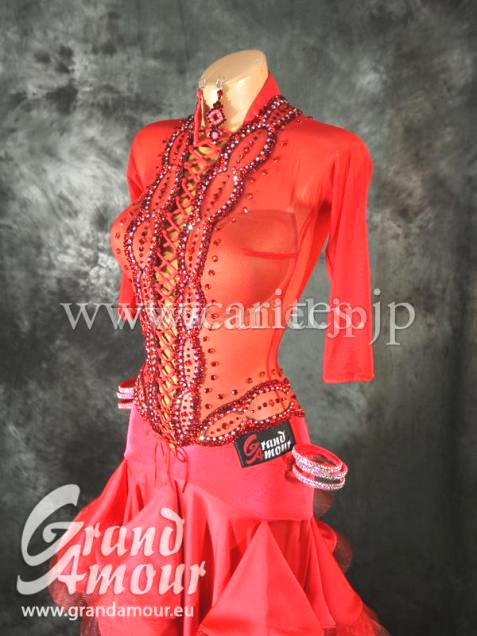 Grand Amourのパソドレスです。真っ赤なベースカラーです。襟元から腰にかけて可愛らしいエレメントがあります。前面の編み上げ部分は透け感がありますが、ヌードカラーのネットが貼ってあるため露出はありません。後ろはハイネックですが首元は詰まっていないタイプのものです。腰回りはベルベット素材をしているので伸縮性があり、ヒップにもとくフィットします。スカート上部に付いた布が踊るとコロコロと動きます。背中にファスナーがあるので着脱が簡単です。