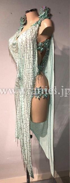 エレガントなペパーミントのドレープにはたっぷりとスワロフスキーストーンが散りばめられ、ビーズフリンジがあしらわれています。