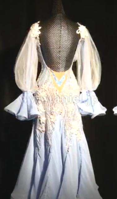 淡いブルーに白のモチーフレースの装飾が可愛らしいドレスです。