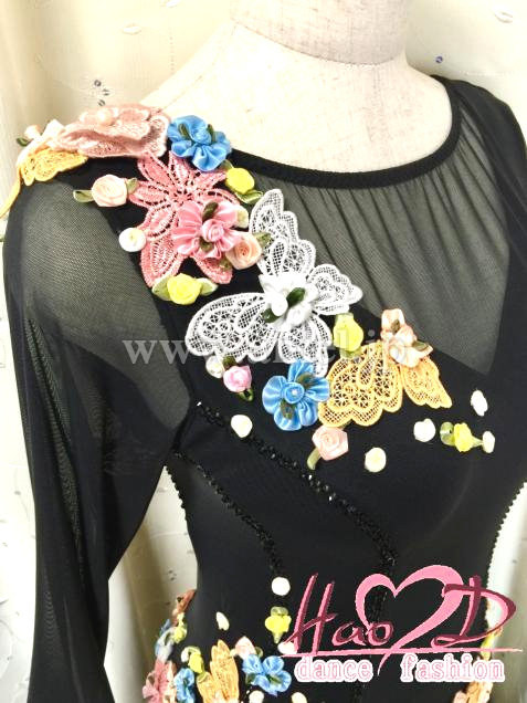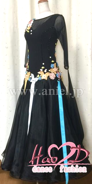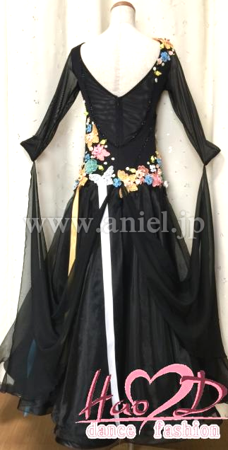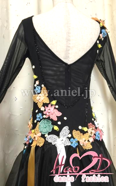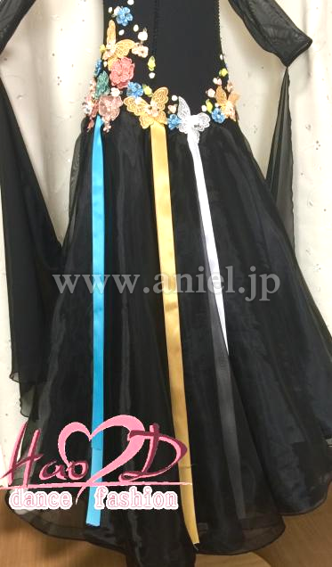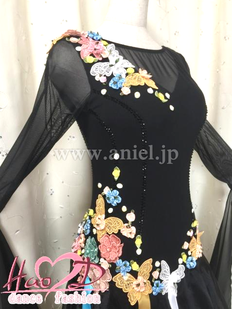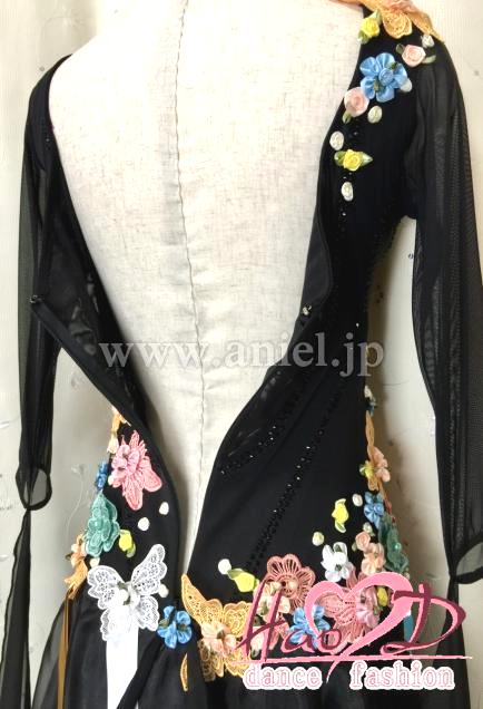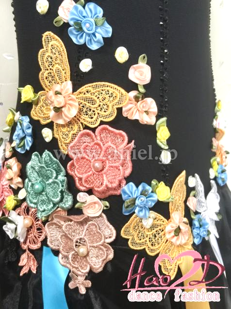 肩や腰骨周りに、カラフルな花と蝶々のモチーフを配置し、とても可愛らしい