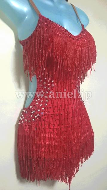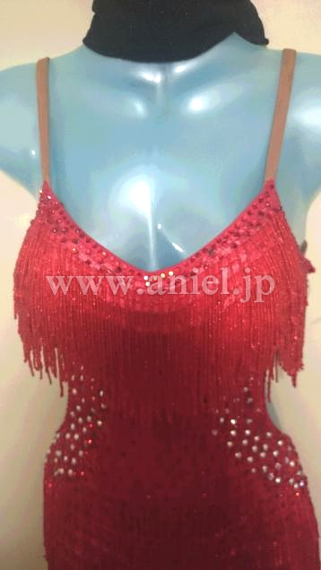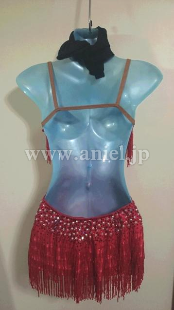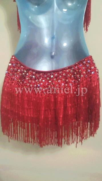 全体にビーズフリンジがたくさん付けられ踊るとキラキラとよく光ります。ウエストサイドとヒップにはストーンがたくさん付けられ、ボディのラインがウエストを細く見せてくれます。