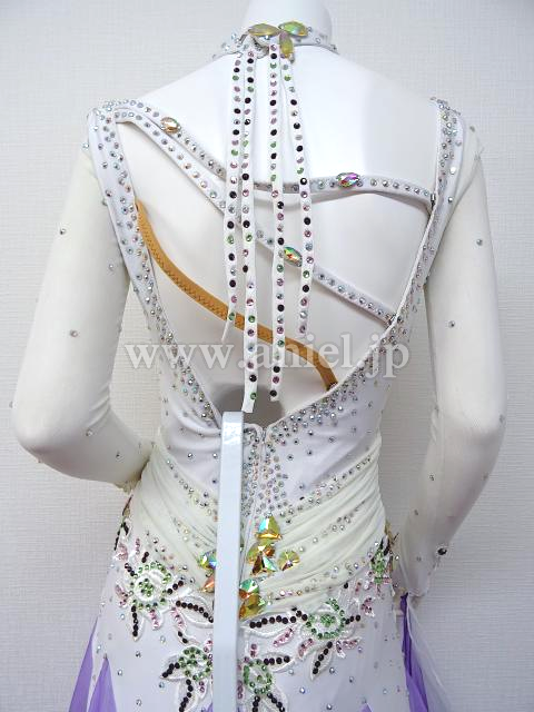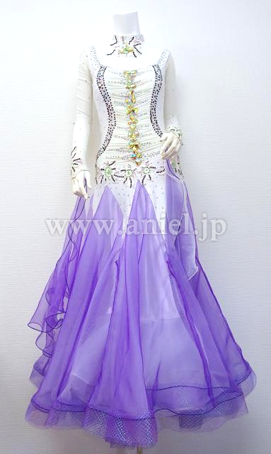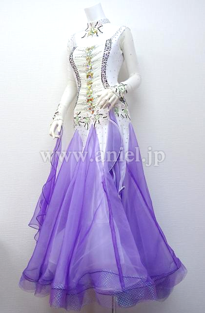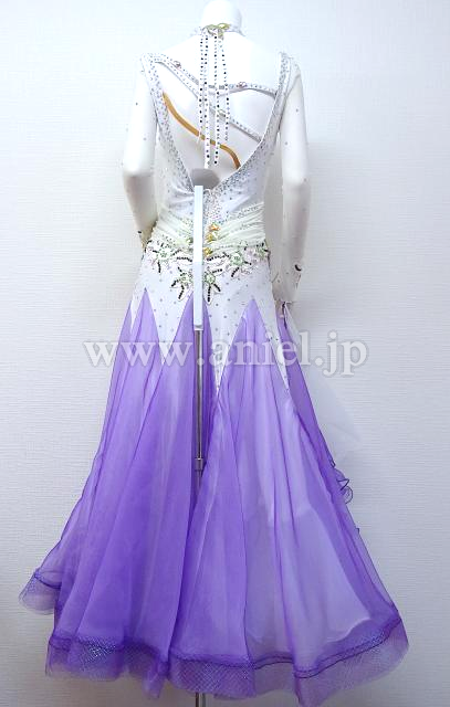 白のボディに紫の透け感のスカートが映えるドレスです。