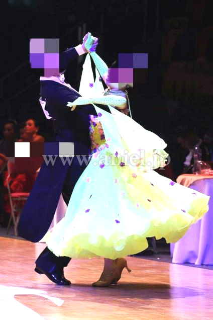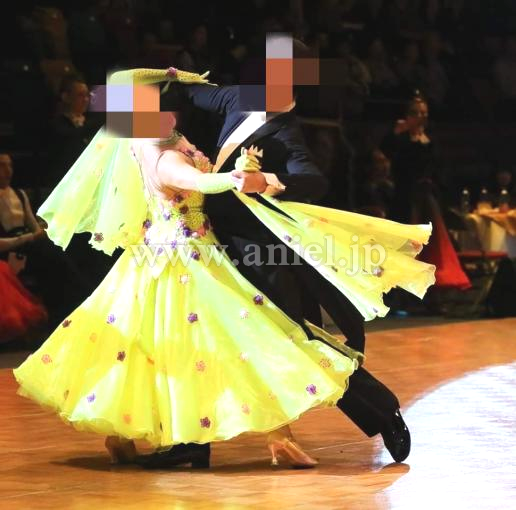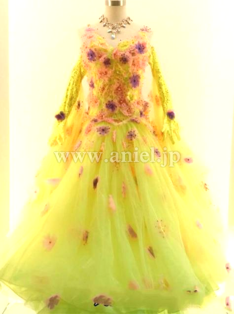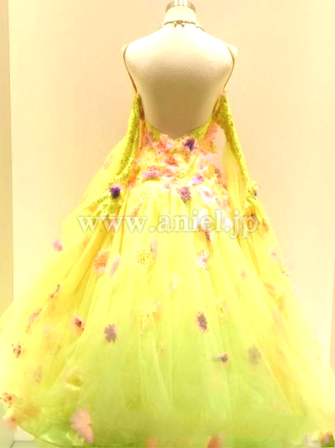 黄色のボディに立体のカラフル小花が散らされた華やかなドレス。