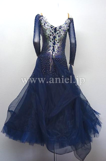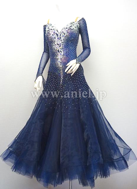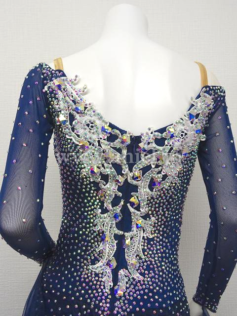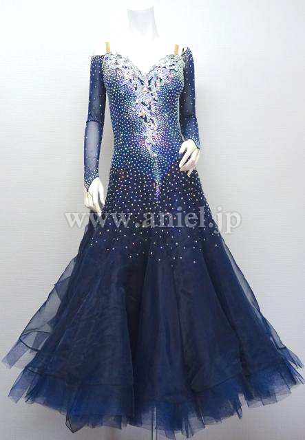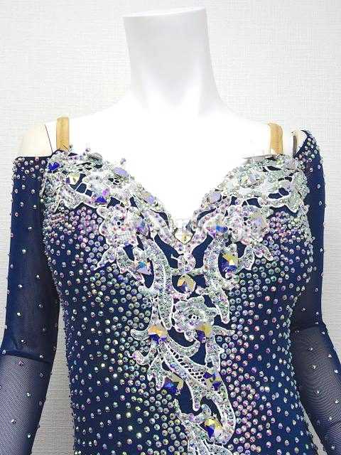 シルバーのモチーフレースが効いているネイビーカラーのドレス。