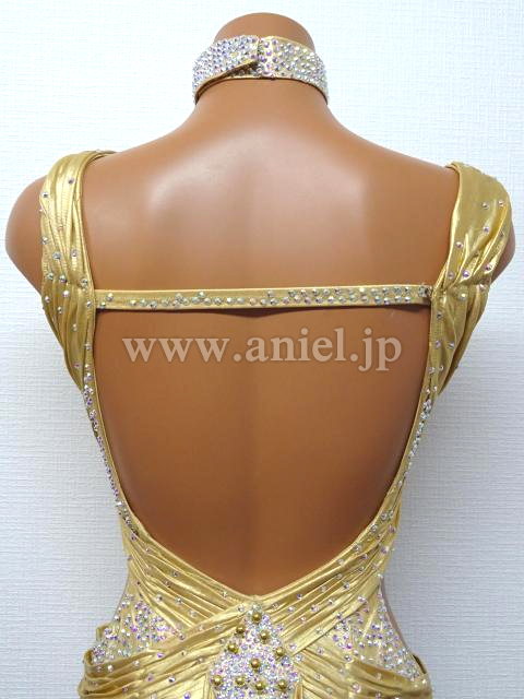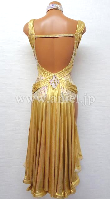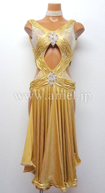 ゴールドのロングフレアスカートドレス。