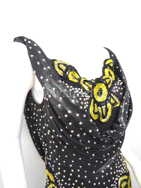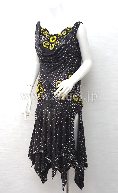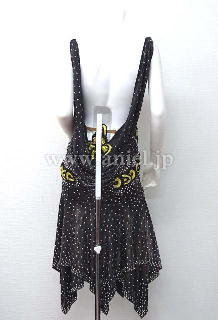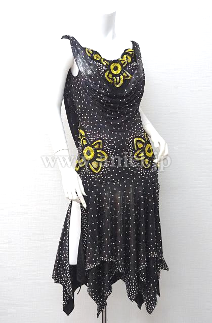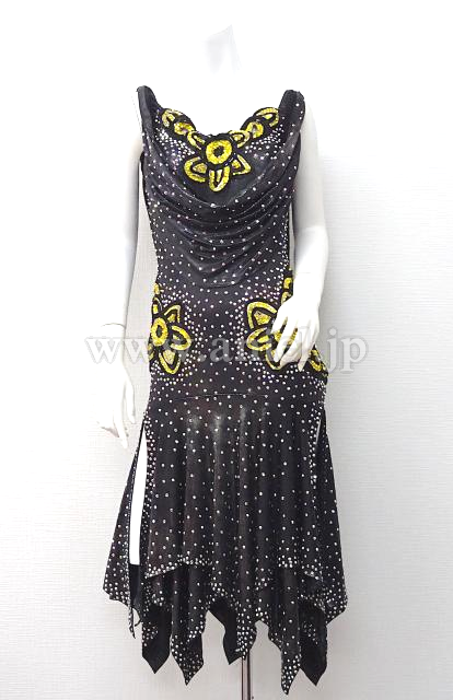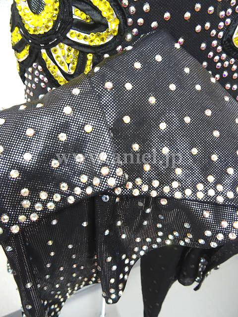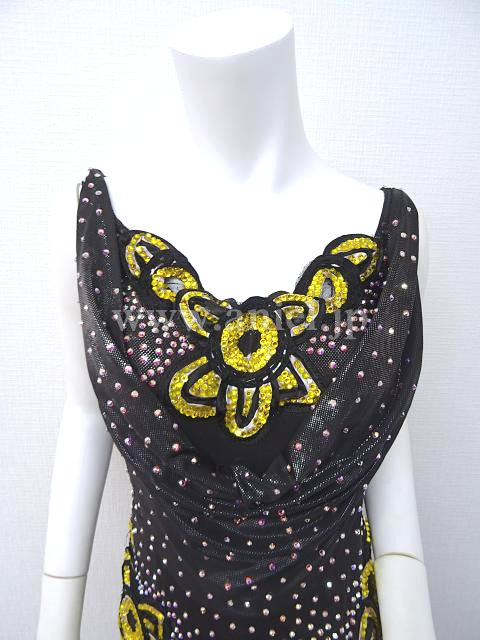 メタリックな黒生地に黄色の花モチーフが胸元と両腰に付いてます。