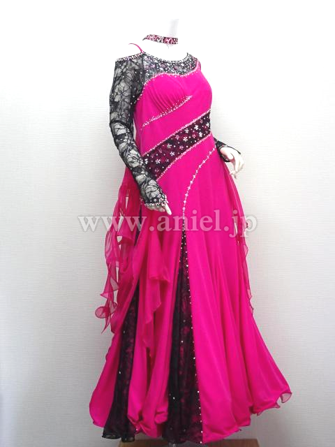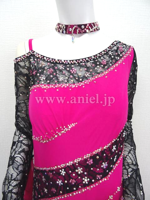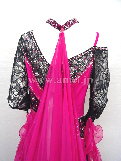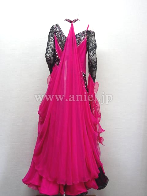 鮮やかなピンクに黒のレースの切り返しが印象的なドレス。