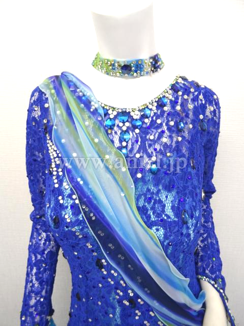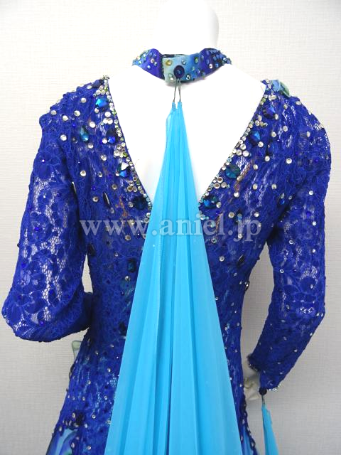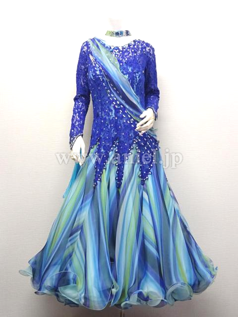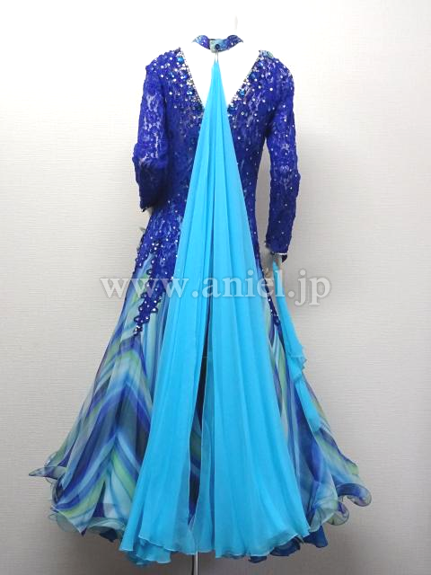 青のレースのボディに珍しいストライプのスカートが合わせてあるドレス。