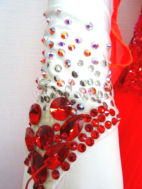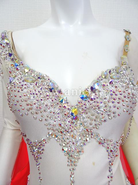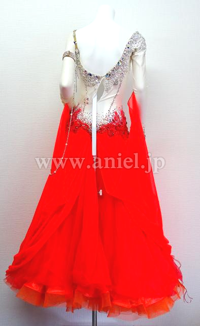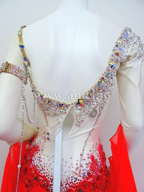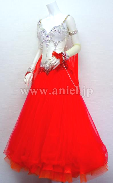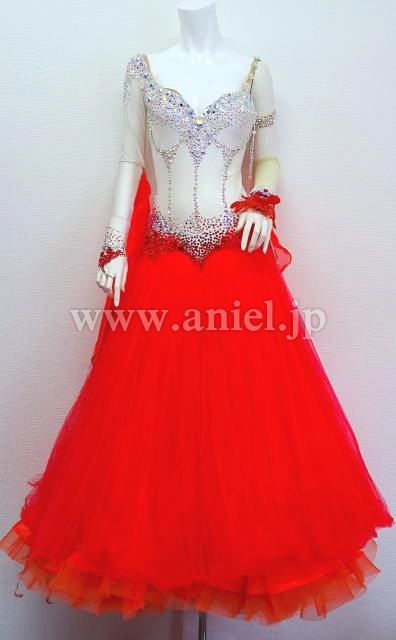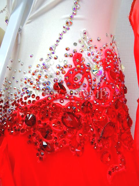 白に明るい赤のスカートが華やかなドレスです。