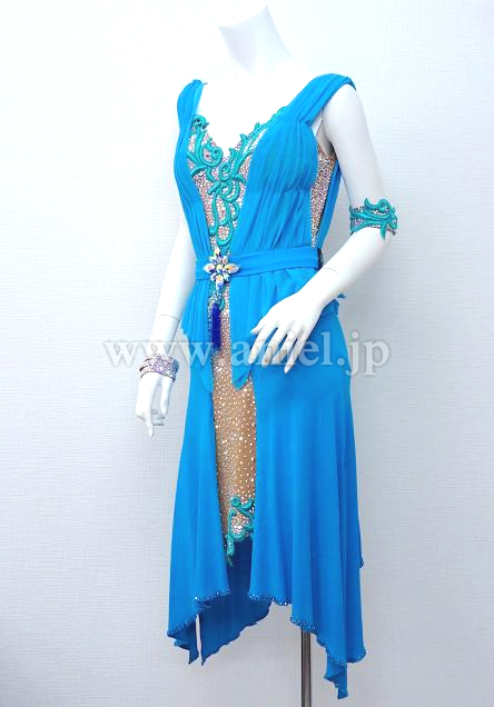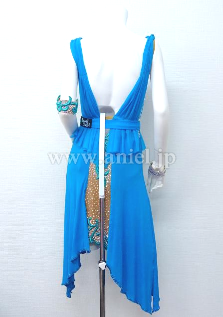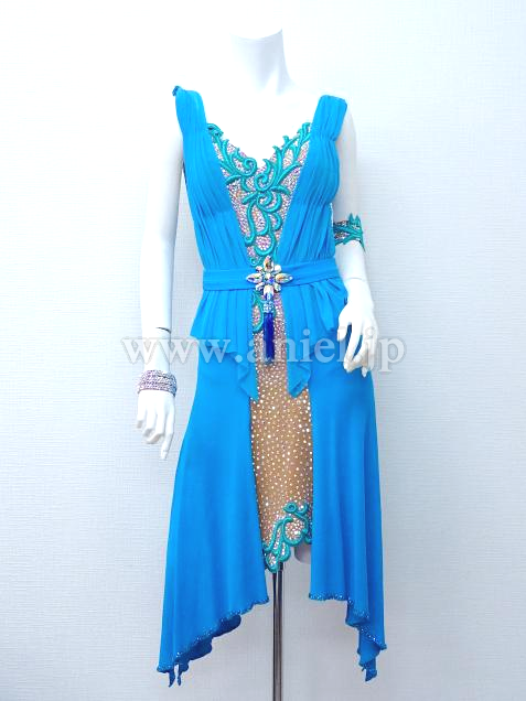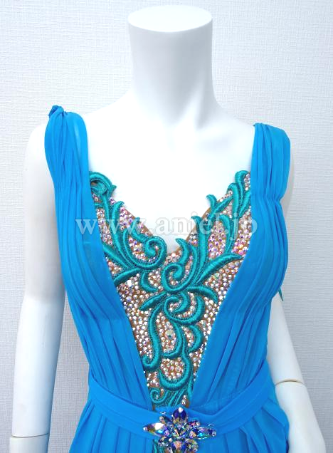 ベージュのボディに水色のドレープがカーディガンのようにつけられたワンピースドレス。