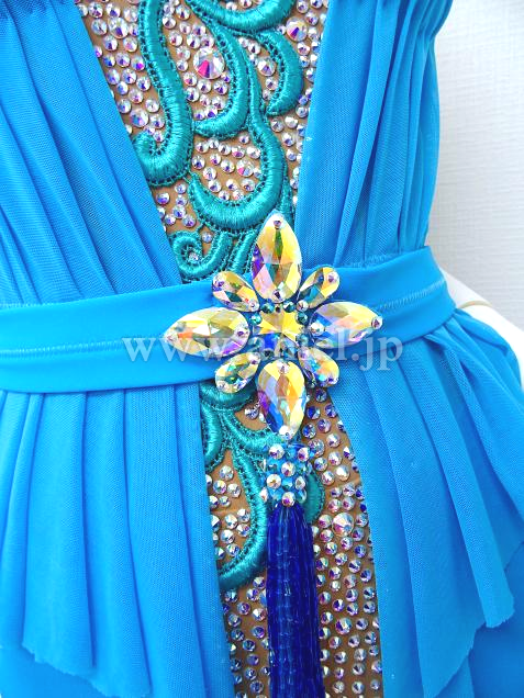 さりげないペプラムデザインで、ウエストマークのベルトのセンターの大粒ストーンで作られたモチーフがワンポイントに。