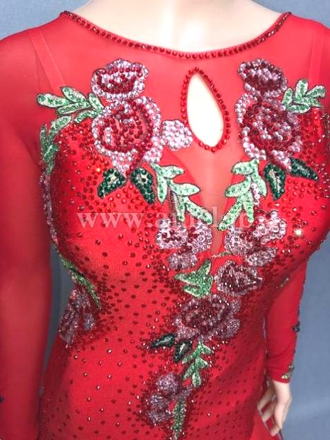 ローウエスト切り替えで デコルテと背中、袖はシースルーになっています