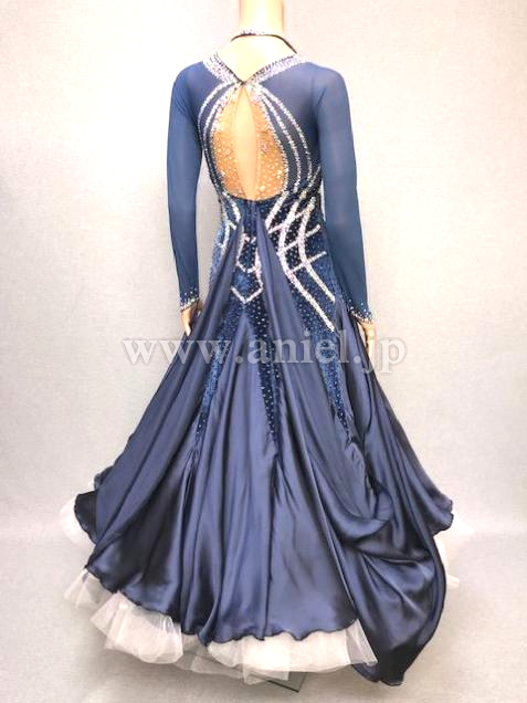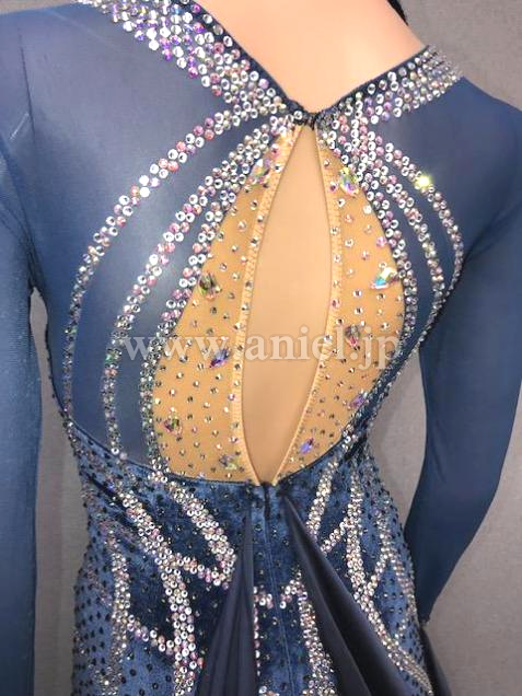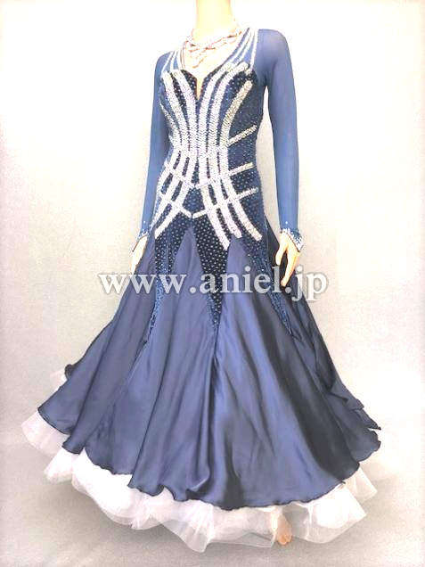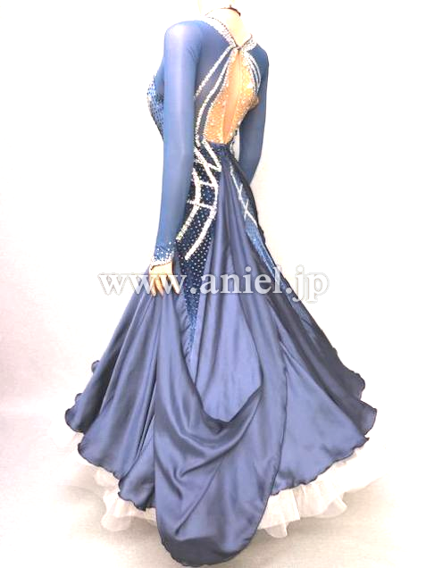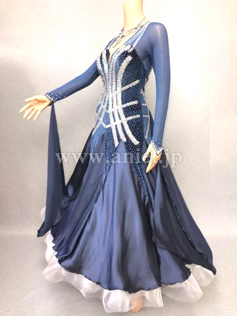 ブルーグレーのベロア地とシフォン地で落ち着きと高級感のあるドレスです
