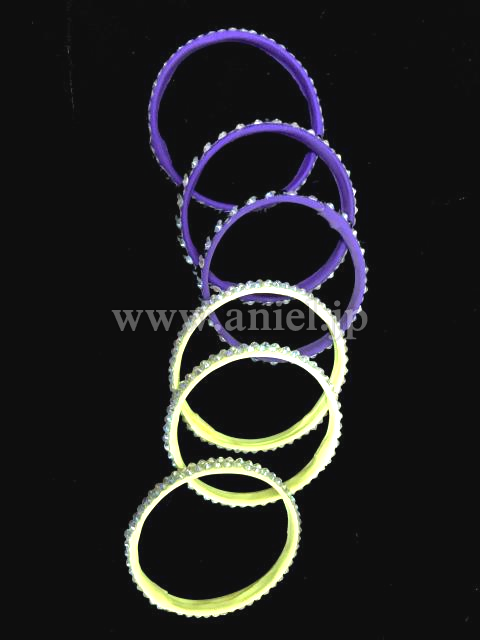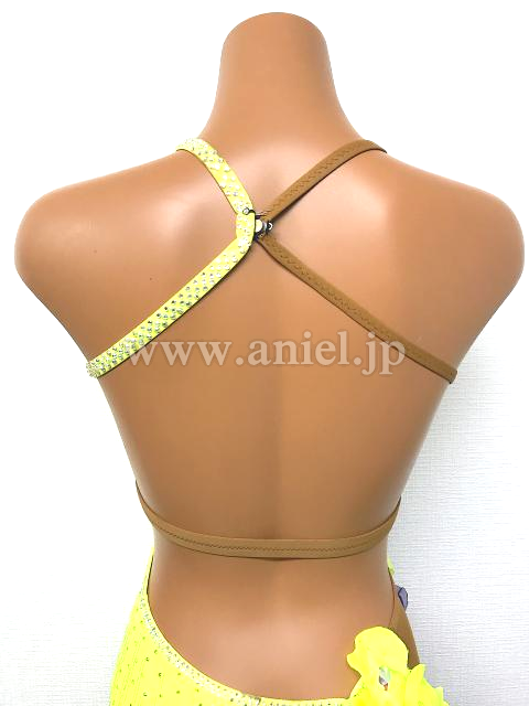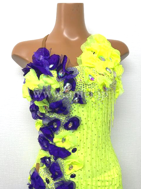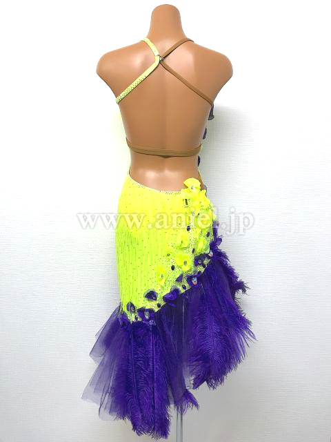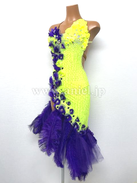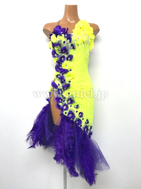 蛍光黄色と紫の羽根がゴージャスなドレス